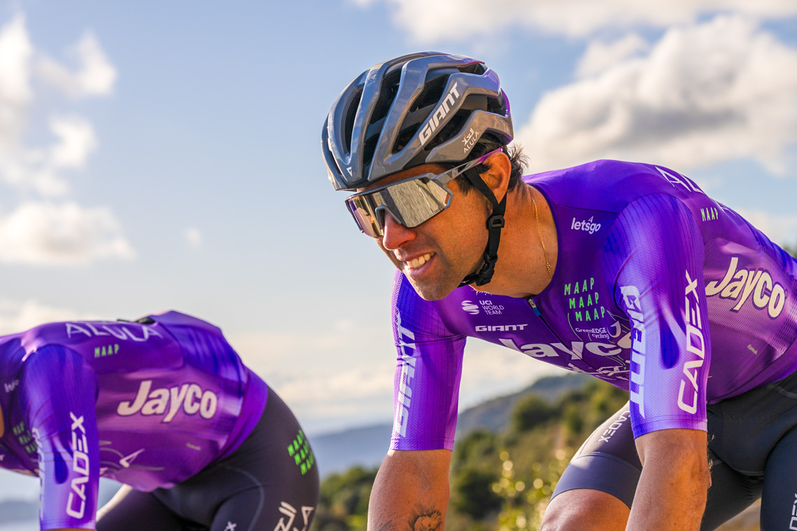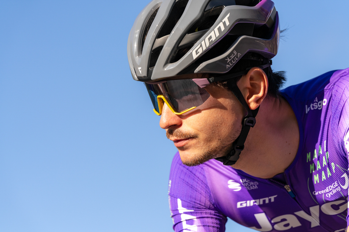 今回Team Jayco AlUlaのチームカラーが登場したのは、GIANTアイウェアの新しいハイエンドモデル「Aurea(アリア)」。精密光学機器のリーディングブランドとして知られるドイツ・ZEISS製レンズが、強い日差しの下でも光のバランスを最適化し、コントラストを高めることで、クリアかつ精細な視界を提供します。