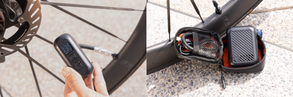 ▲左:充填空気圧は0.05bar / 0.5PSi単位で指定 / 右:持ち運びに便利なソフトケース、TPUチューブ対応用延長ホース、充電ケーブルが付属