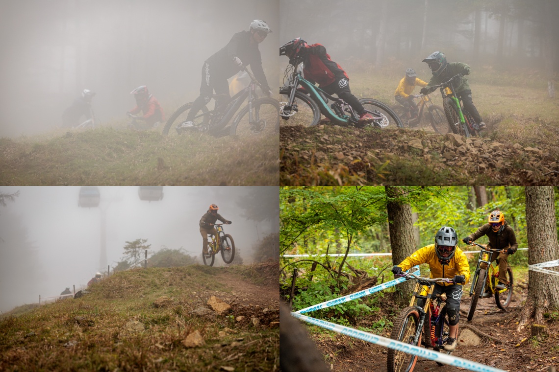 GIANTのグラビティMTB「Glory」および「Reign」シリーズ限定のグループライドは、迫力満点の内容に。山頂付近は霧がかかる中、清水一輝選手やグラスルーツメンバーとともにコースを走り、高速バームターンやジャンプセクションをトレインライドで駆け抜けました。