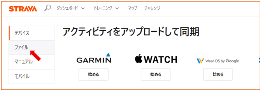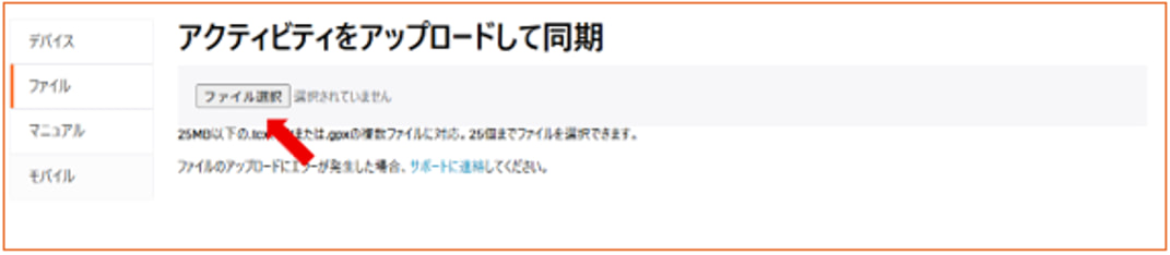 ④「ファイル選択」をクリックして、アップロードしたい.fitファイルを選択する