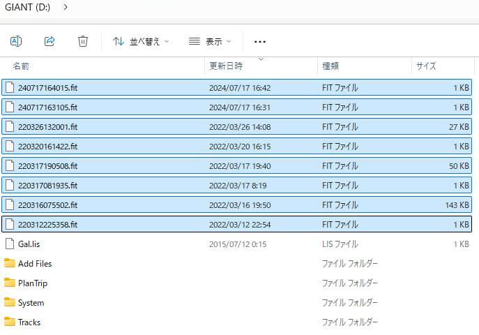 ④一番上の階層に保存されている「yymmddhhmmss.fit」(年月日時刻をファイル名としています)を、ドラッグ&ドロップなどでPCにダウンロードする
