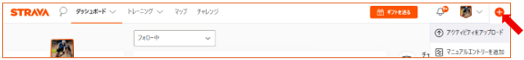 ② 画面右上の+印にカーソルを合わせ、「アクティビティをアップロード」をクリックする