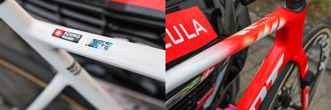 ▲左:トップチューブに貼られたカタカナのネームシールはファンからのプレゼント / 右: 赤と白の2色でスイス国旗を表現したスペシャルペイント