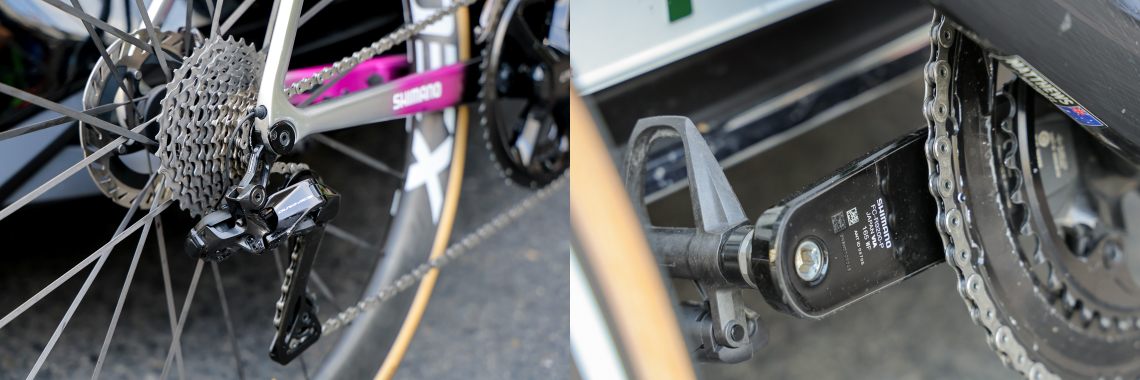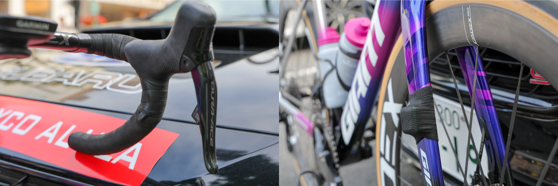 コンポーネントとペダルはシマノの最高峰グレードであるDURA-ACE。ギアは前:54-40T / 後:11-34Tの組合せで、昨今トレンドとなっているショートクランクを取り入れ165mmを選択。ハンドルのドロップ部にはスプリンタースイッチを装着しています。計測チップの固定方法にはメカニックの一工夫があり、一般的に使用されるタイヤ用チューブに替わって、ソックスから切り出したという布チューブを使用。結束バンドなしでも適切に計測チップを固定できる一方で、伸縮性に富む生地でできているため脱着が容易という優れものでした。