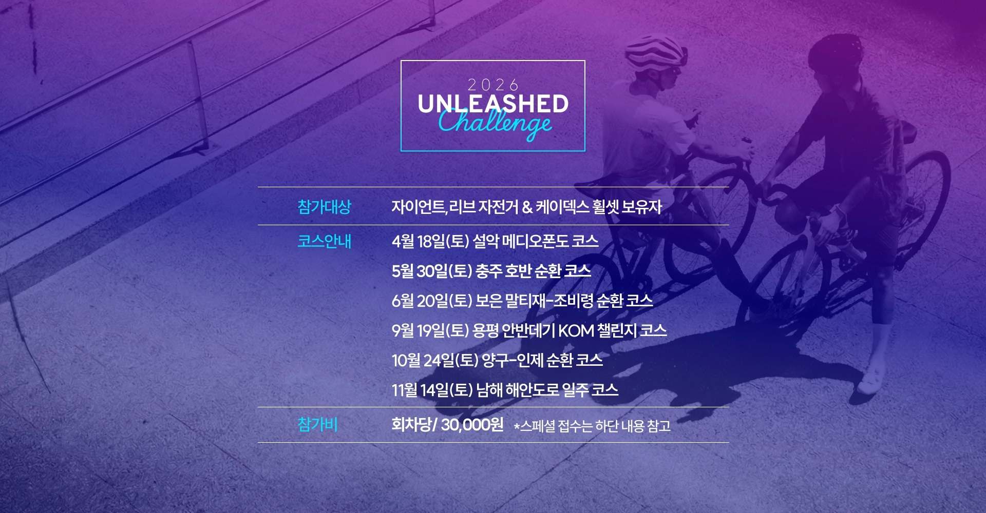 - 각 코스는 거리·고도·난이도가 상이하므로, 본인의 체력과 라이딩 경험을 고려해 회차를 선택해 주세요.