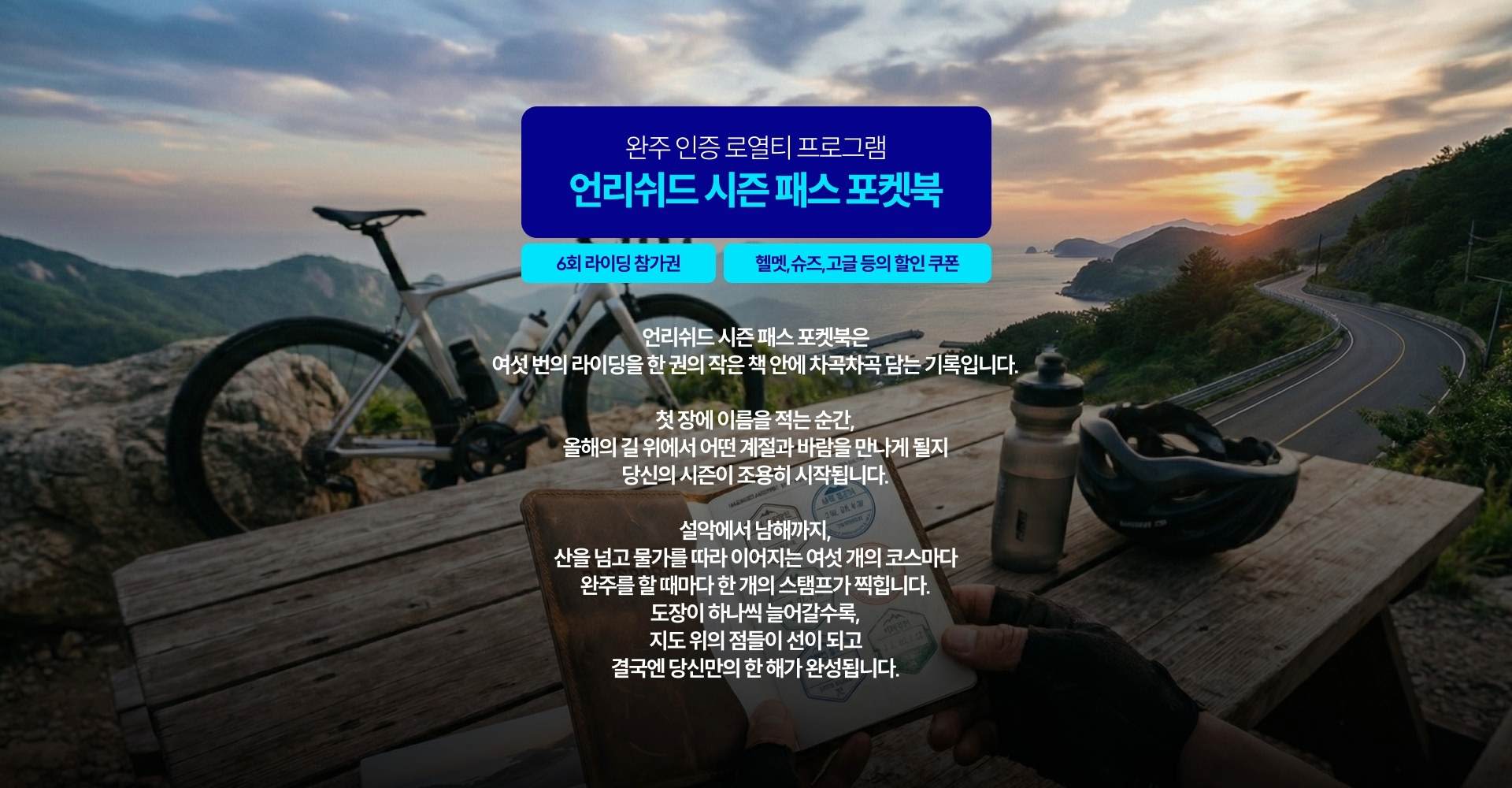 “올해는 진짜 꾸준히 타보자” 마음먹은 라이더, 설악부터 남해까지, 여섯 코스를 모두 경험해보고 싶은 분, 완주 스탬프를 차곡차곡 모아서 언리쉬드 시즌 패스 포켓북을 꽉 채우고 싶은 분