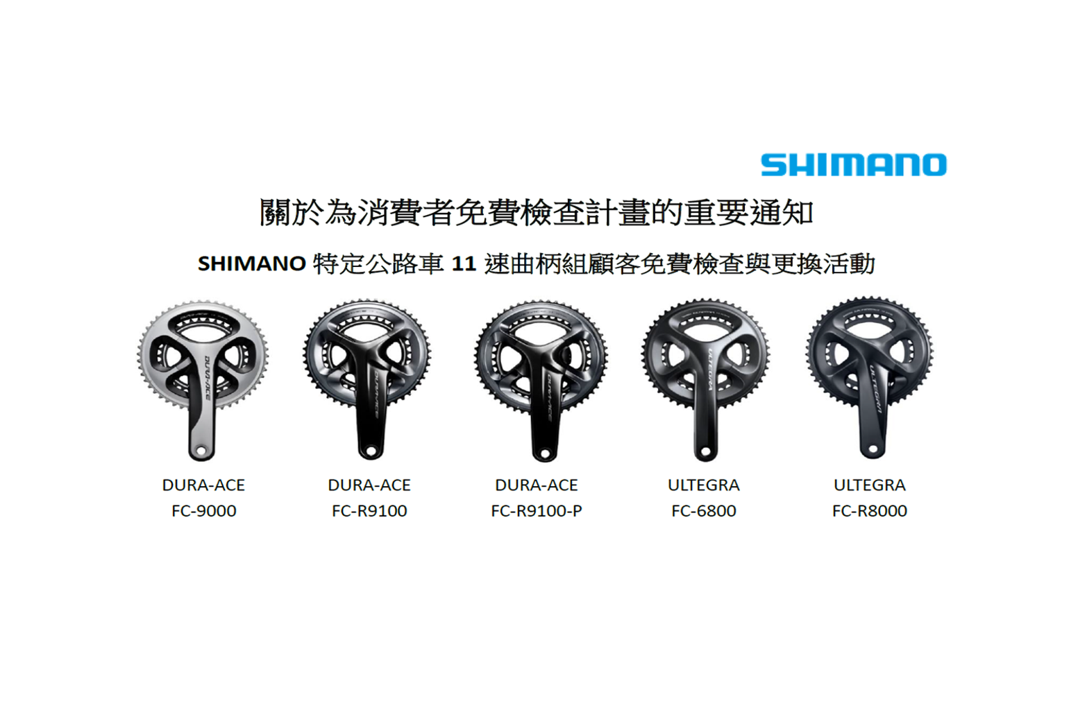 因本公司2012年6月~2019年6月生產之特定DURA-ACE、ULTEGRA系列曲柄組(型號:FC-9000、FC-R9100-P、FC-R9100、FC-6800及FC-R8000;製造代碼:KF、KG、KH、KI、KJ、KK、KL、LA、LB、LC、LD、LE、LF、LG、LH、LI、LJ、LK、LL、MA、MB、MC、MD、ME、MF、MG、MH、MI、MJ、MK、ML、NA、NB、NC、ND、NE、NF、NG、NH、NI、NJ、NK、NL、OA、OB、OC、OD、OE、OF、OG、OH、OI、OJ、OK、OL、PA、PB、PC、PD、PE、PF、PG、PH、PI、PJ、PK、PL、QA、QB、QC、QD、QE、QF、QG、QH、QI、QJ、QK、QL、RA、RB、RC、RD、RE 及 RF,合計26,415支),由於疑似有接合脫離跡象,可能會造成顧客騎乘時失去平衡、跌倒或受傷,而有影響行車安全疑慮。為了各位車友的騎乘安全,請務必檢查您愛車上是否搭載以上 SHIMANO 11速曲柄組,